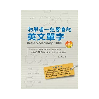 《初學者一定要會的英文單字》彙整出1000字英語基本字彙,並且利用聯想與對比的分類方式,讓你認識基礎單字以及關於家庭、身體與行動、人物與描述、情感與思想、職業、服飾配件和顏色、食物與飲品、數字、時間與日期、消費與嗜好、家庭用品、國家與地方、學校與學習、交通運輸、方向與位置、尺寸、測量與數量、動物、自然與天氣等20個主題。讓初次認識英語的你,輕鬆愉快地藉由這些貼近生活的單字,開始英語學習的第一步!